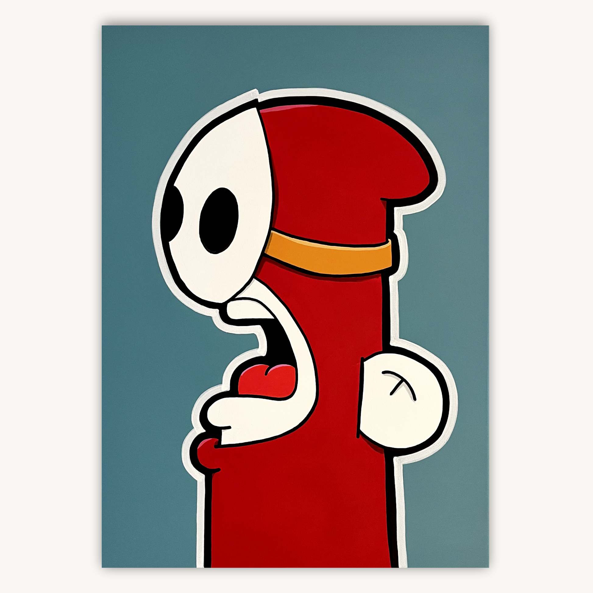 Step into the world of "Shouter vs Shy Guy," a 50 by 70 cm single-edition painting. The Shouter merges with the mysterious allure of Shy Guy, donning the character's iconic red hood and mask. This evocative piece delves into themes of anonymity and expression, unmasking the layers of identity hidden beneath the Shy Guy's quiet facade.